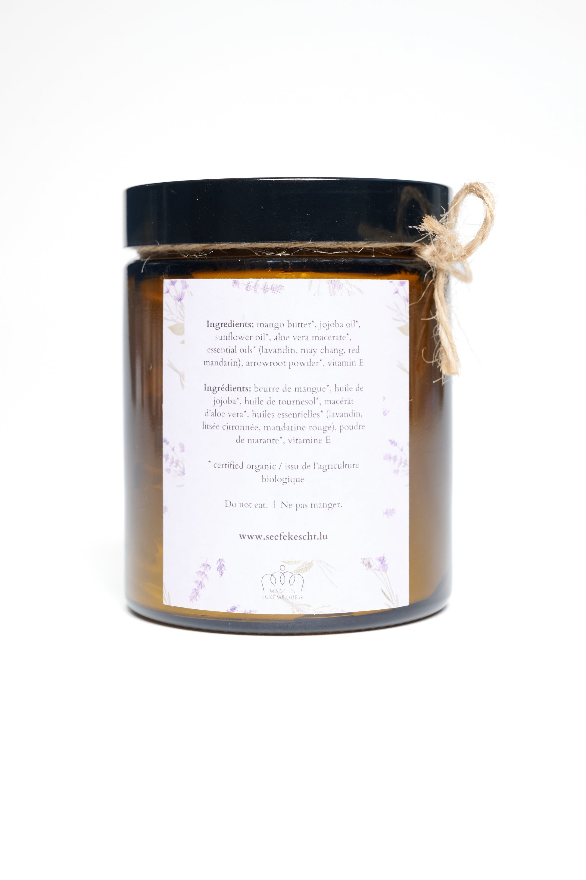 Mango butter*, Jojoba oil*, Sunflower oil*, Aloe vera macerate*, Essential oils* (lavandin, may chang, red tangerine), Arrowroot powder*, Vitamin E